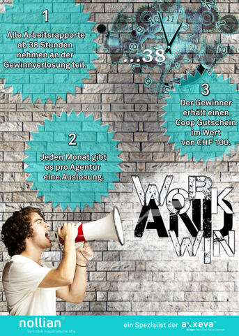 WorkAndWin Wir stellen vor: unser Membersystem "WorkAndWin". Während der kommenden Monate nehmen sämtliche Arbeitnehmer mit einem Einsatz ab 38 Stunden bei der nollian automatisch an unserer Verlosung teil. Auf die glücklichen Gewinner warten diverse Gutscheine im Wert von CHF 100 - WorkAndWin! |